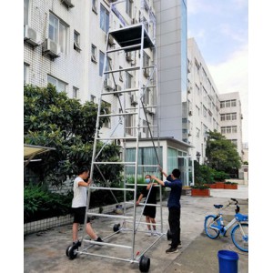 梯車(車梯)選用高強度鋁合金材料制造,型材截面設計合理,重量輕,車梯底架用鋼管制造,保證底架的穩定性和安全性,不變形。車輪為稀土尼龍輪強度高、運轉無噪音、絕緣性能好,其中有一車輪鑲嵌鋼環,解決安全接地問題。