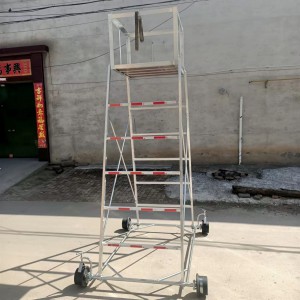 梯車(車梯)選用高強度鋁合金材料制造,型材截面設計合理,重量輕,車梯底架用鋼管制造,保證底架的穩定性和安全性,不變形。車輪為稀土尼龍輪強度高、運轉無噪音、絕緣性能好,其中有一車輪鑲嵌鋼環,解決安全接地問題。