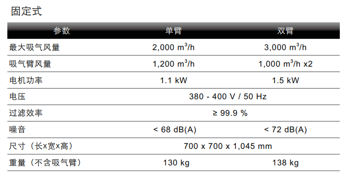 可滿足大范圍移動的煙塵凈化需求。固定式凈化器可安裝在廠房墻面或立柱上,占地空間小,標準吸氣臂長度可達8m,更長吸氣臂可選配。