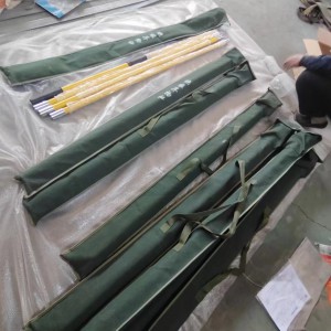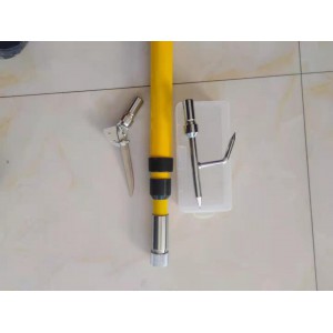 接觸網挑異物桿、雜物桿是用來清除掛在供電線路上的異物(如樹枝 塑料袋 風箏等)的專用工具,其功能可以挑、鉤、鋸、打。該工具用環氧樹脂玻璃纖維管材料為桿身,絕緣性能好。重量輕,可以伸縮,攜帶方便,桿頭部刀據和鉤尖用不銹鋼或絕緣材料制作,不但防銹,而且鋒利。更換方便。伸縮機構是定位銷鎖緊,伸長時拉出,當拉到看見刻線時停住,而后左右轉動,轉到一定角度,定位銷會自動彈出,從而定位鎖緊,當收縮時用手指按下定位銷同時往里推內管即可縮短。