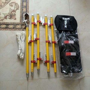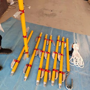 4. 接完后:用風繩栓在鉤一側的環(huán)內(nèi),一人穩(wěn)住底部,一人拉繩,一到二人往起立,根據(jù)梯子的長短限定人數(shù),立起后把掛鉤勾在承力索或其它能固定的地方。