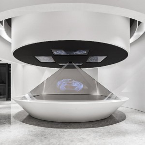 柜體時尚美觀,有科技感;頂部四面透明,真正的空間成像;色彩鮮艷,對比度,清晰度高;有空間感,感,形成空中幻象;中間可結合實物,實現影像與實物的結合;也可配加觸摸屏實現與觀眾的互動;