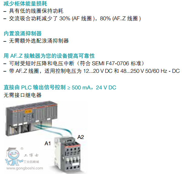 AF接觸器采用標準的AF技術,現已成為業內新標準。它采用電子控制線圈,比傳統方案具有更多優勢。可以與ABB其他廣泛的產品系列配合使用,隨時為您提供*佳的配置方案。