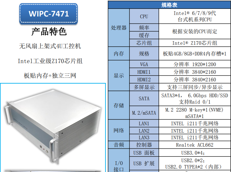 福升威爾WIPC-7471/6代/8GB/500G/無風扇上架式 4U工控機 |