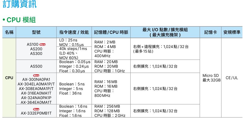 32- bit SoC CPU,大幅提昇效能 (40k steps / ms),***多可擴(kuò)充32臺(tái)模組或***大1,024點(diǎn)I/O;
