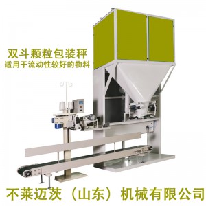 雙斗定量包裝秤采用鋼架結構材料,獨立懸掛傳感器稱重。具有操作簡便,稱重***,計量速度快等特點。 雙斗定量包裝秤主機采用雙給料器裝置,雙獨立稱重斗計量,該系統由A,B兩個稱量斗組成,當收到開工信號后AB兩稱給料器同時打開,物料從料倉通過給料器自流分別進入A稱B稱重料倉,通過給料器進行二級高低速給料。當物料分量到達快給料設定值時,停止快給料,持續慢給料;當物料分量到設定定量值時,關閉給料門,完結A稱與B稱動態稱重進程,當檢測到夾帶裝置開始工作表明已加緊袋子,A稱量斗下的放料門打開,物料瞬間裝入料袋,其夾袋器打開,料袋輸送到縫紉單元,緊接著A稱給料器打開,開始進入A稱的二次稱量。A斗放料的同時B稱量斗已經稱量完畢可緊接著套袋放出B稱稱量斗內物料,兩系統循環交替稱重放料,有效的利用稱量時間使工作效率成倍增長。