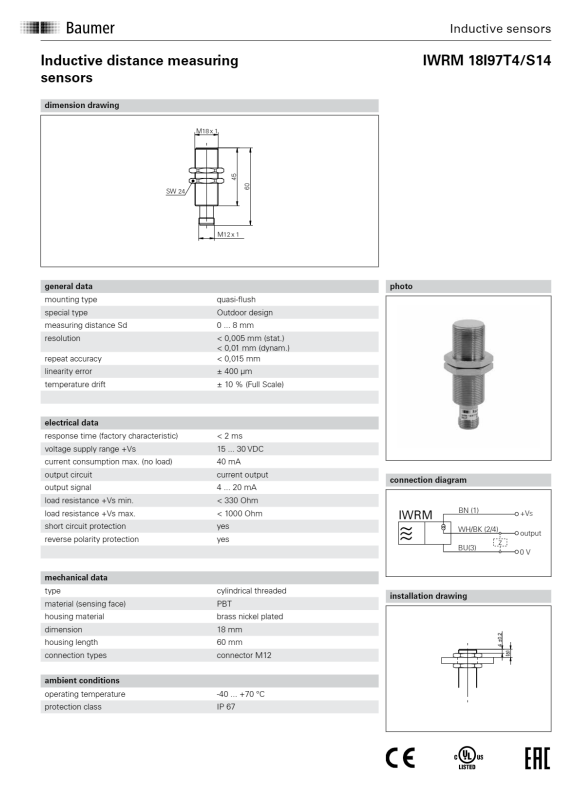 Baumer 堡盟電感式測距傳感器 IWRM 18I97T4/S14 測量傳感器 |