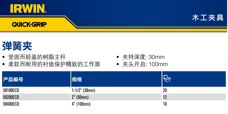 美國IRWIN歐文工具快速單手夾木工G字夾C型單手夾 2英寸(50MM) 59200ECD