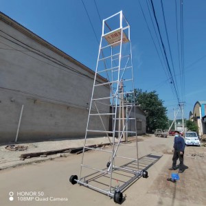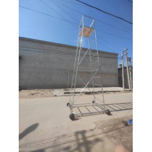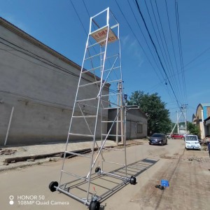 梯車(車梯)選用高強度鋁合金材料制造,型材截面設計合理,重量輕,車梯底架用鋼管制造,保證底架的穩定性和安全性,不變形。車輪為稀土尼龍輪強度高、運轉無噪音、絕緣性能好,其中有一車輪鑲嵌鋼環,解決安全接地問題。