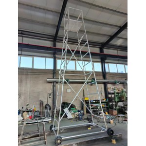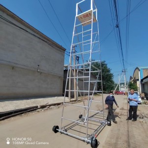 梯車(車梯)選用高強度鋁合金材料制造,型材截面設計合理,重量輕,車梯底架用鋼管制造,保證底架的穩定性和安全性,不變形。車輪為稀土尼龍輪強度高、運轉無噪音、絕緣性能好,其中有一車輪鑲嵌鋼環,解決安全接地問題。