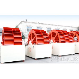 洗砂機結構由輪斗、機座、傳動裝置等組成,經過電動機和減速機的傳動,驅動水槽中葉輪不停在水槽中作圓周性轉動,從而將水槽中的砂石或礦渣顆粒物料在水中攪拌、翻轉、淘洗并使受水物料在葉輪中脫水后排出,另外,可根據需求,自由調整篩選的砂石粒度。