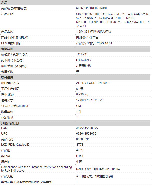 西門子PLC 6ES7331-1KF02-0AB0 S7-300,模擬輸入 SM 331