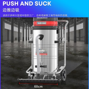 GS-3078P是一款工業型的產品,集塵桶為80L,為不銹鋼材質,配有不銹鋼車架,在移動時輕巧方便;機器除常規手持式吸塵外,還裝置有60cm左右寬的推吸扒頭,可以邊推邊吸,減少了人力物力;可以用在工廠、倉庫或建筑工地等場所清理灰塵等,在商業環境中也可以使用。