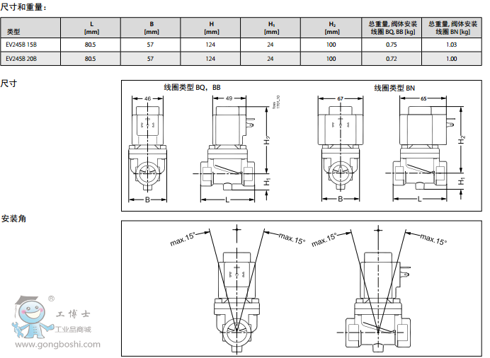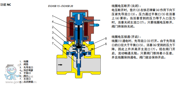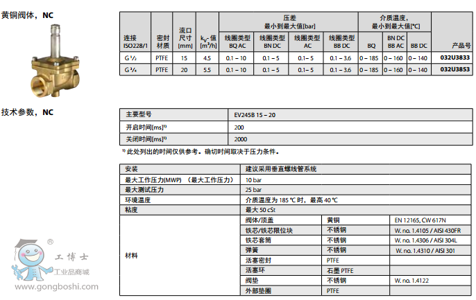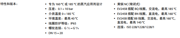 活塞型先導式的設計,并且在主流口使用PTFE密封以及鐵芯使用不銹鋼的閥板,可以確保在蒸汽應用場合里獲得可靠的功能和長久的使用壽命。 版本: EV245B帶BQ線圈, 交流電壓時耐溫可達 185°C EV245B帶BN線圈, 直流電壓時耐溫可達 160°CEV245B帶BB線圈, 交流電壓時耐溫可達 160°C - 直流電壓時耐溫可達 140°C 2位/2通 專為蒸汽應用設計,160°C或185°C 活塞型先導式 DN 15 - DN 25 環(huán)境溫度: +40°C G 1/2” 至 G 3/4” 黃銅閥體 NC(常閉