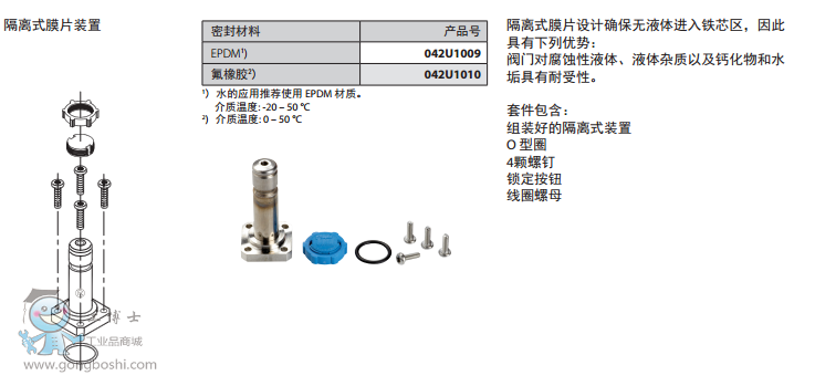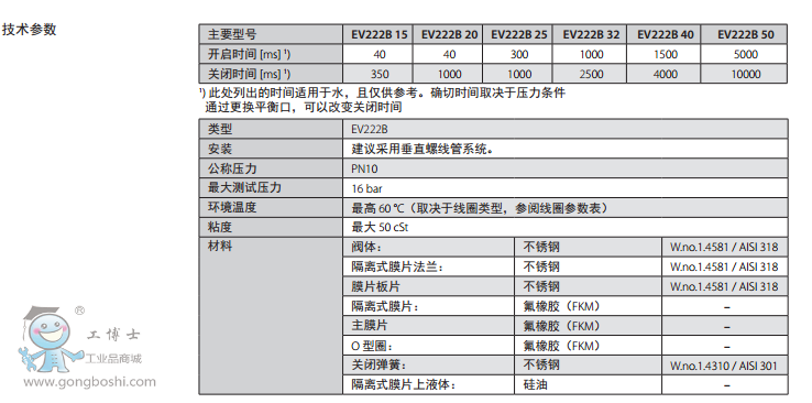 EV222B 是一款適用于污染型或腐蝕性介質的間接先導式電磁閥系列。閥體材質采用不銹鋼;通過隔離膜片防止雜質侵入電磁閥系統;內置導控過濾器;閉合時間可調節,防護等級*高為IP67。這些確保了工作的可靠性和滿意度。 2 位/2 通 先導式 隔離膜片 DN 15 - DN 50 不銹鋼閥體 僅有常閉型號