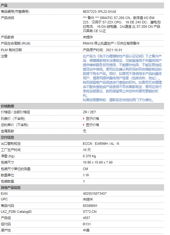 西門子PLC 6ES7223-1PL22-0XA8 S7-200 CN數字量 I/O EM 223