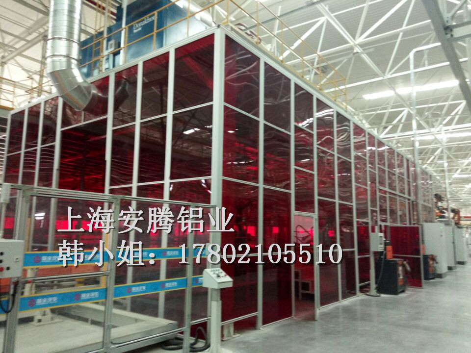 上海安騰鋁業(yè)韓小姐 專業(yè)承接汽車生產(chǎn)流水線安全圍欄,機(jī)器人弧焊房,機(jī)器人打磨房等工業(yè)防護(hù)項(xiàng)目::工業(yè)鋁型材框架安全圍欄,機(jī)器人弧焊房案例展示: