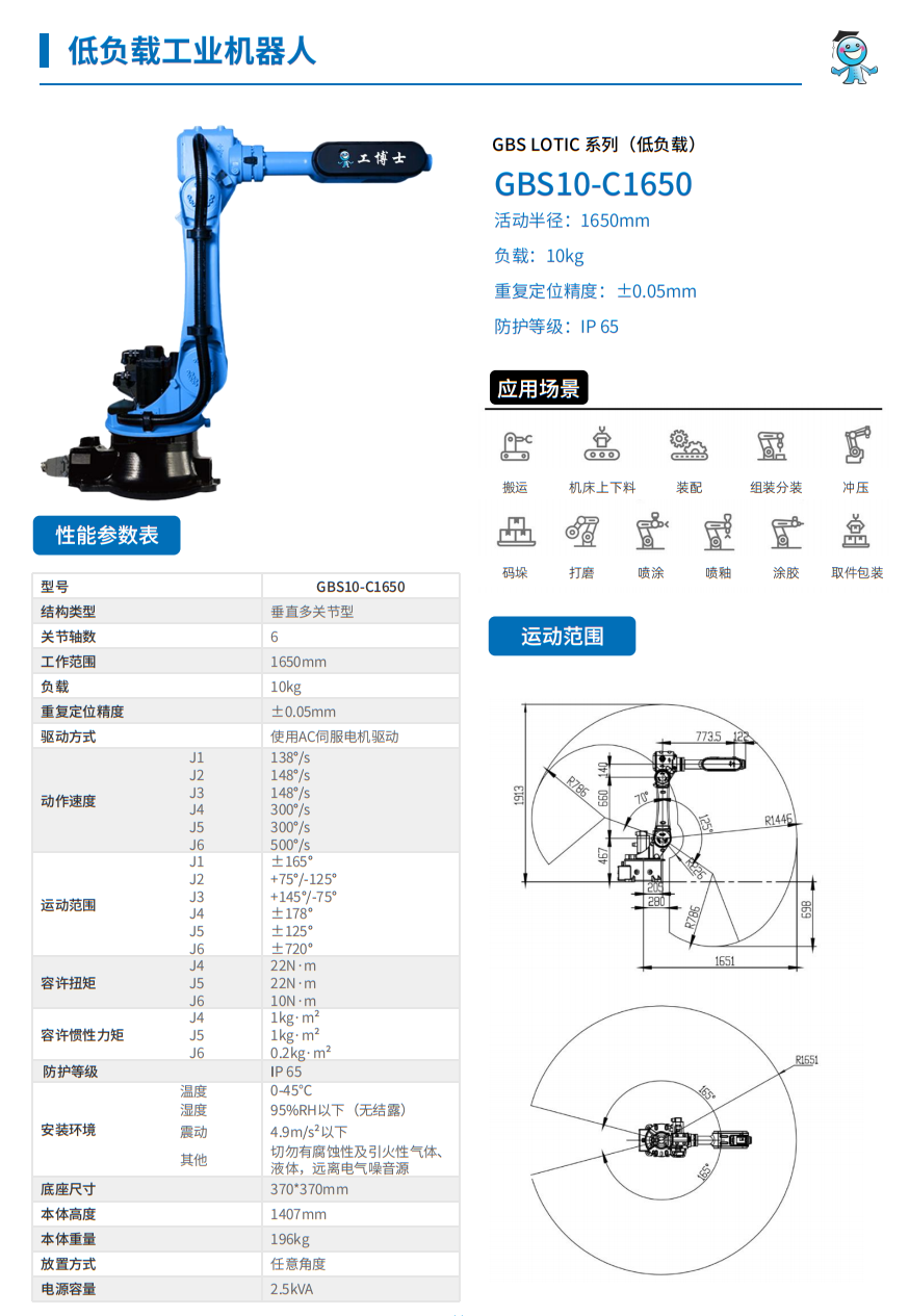 工博士GBS LOTIC系列(低負載)GBS10-C1650 負載:10kg 臂展:1650mm |