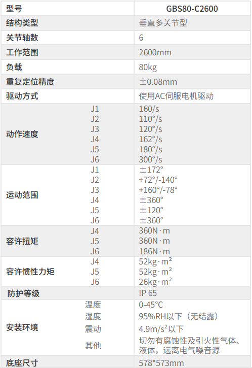 活動半徑:2600mm 負載:80kg 重復定位精度:±0.08mm 防護等級:IP 65