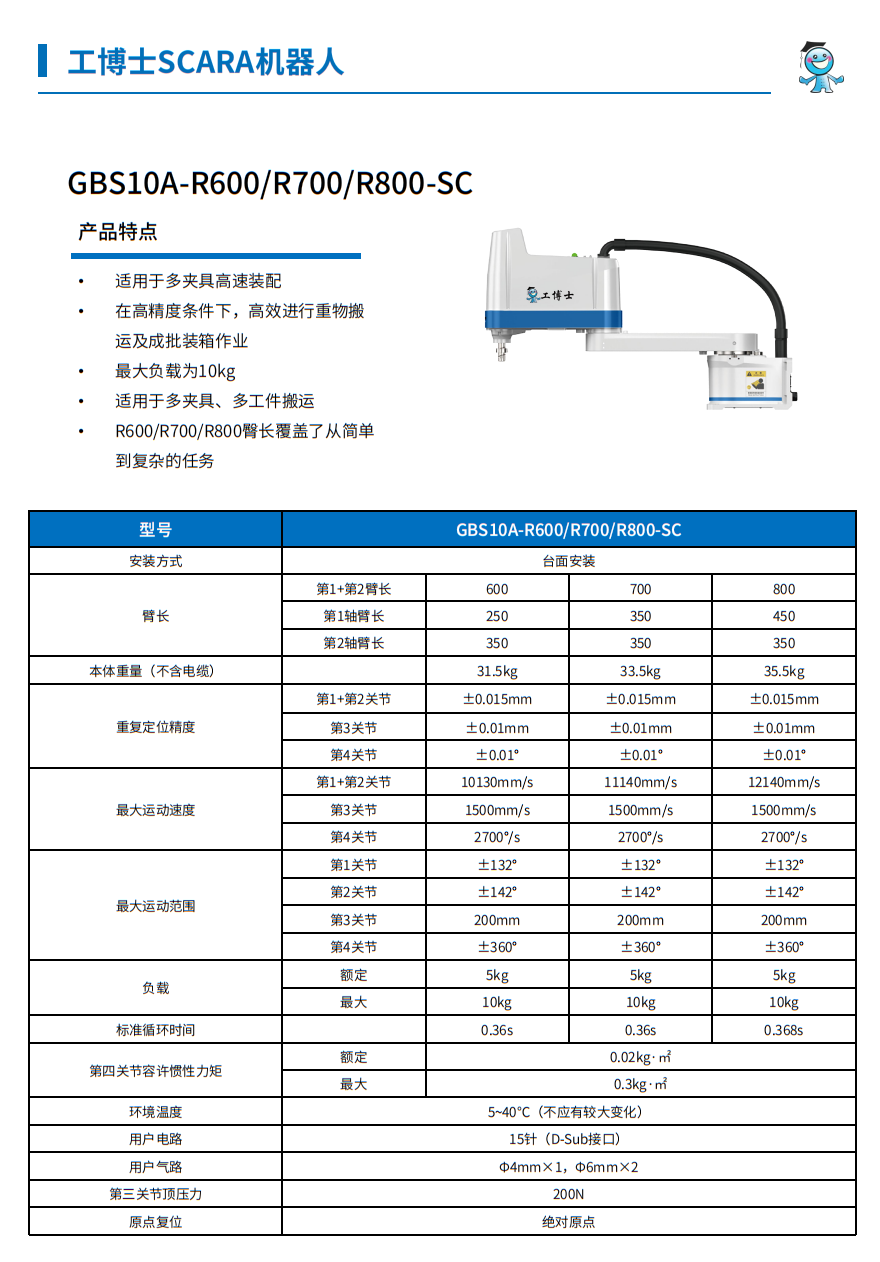 工博士SCARA機器人GBS10A-R700-SC 負載:10kg 臂長:700mm |