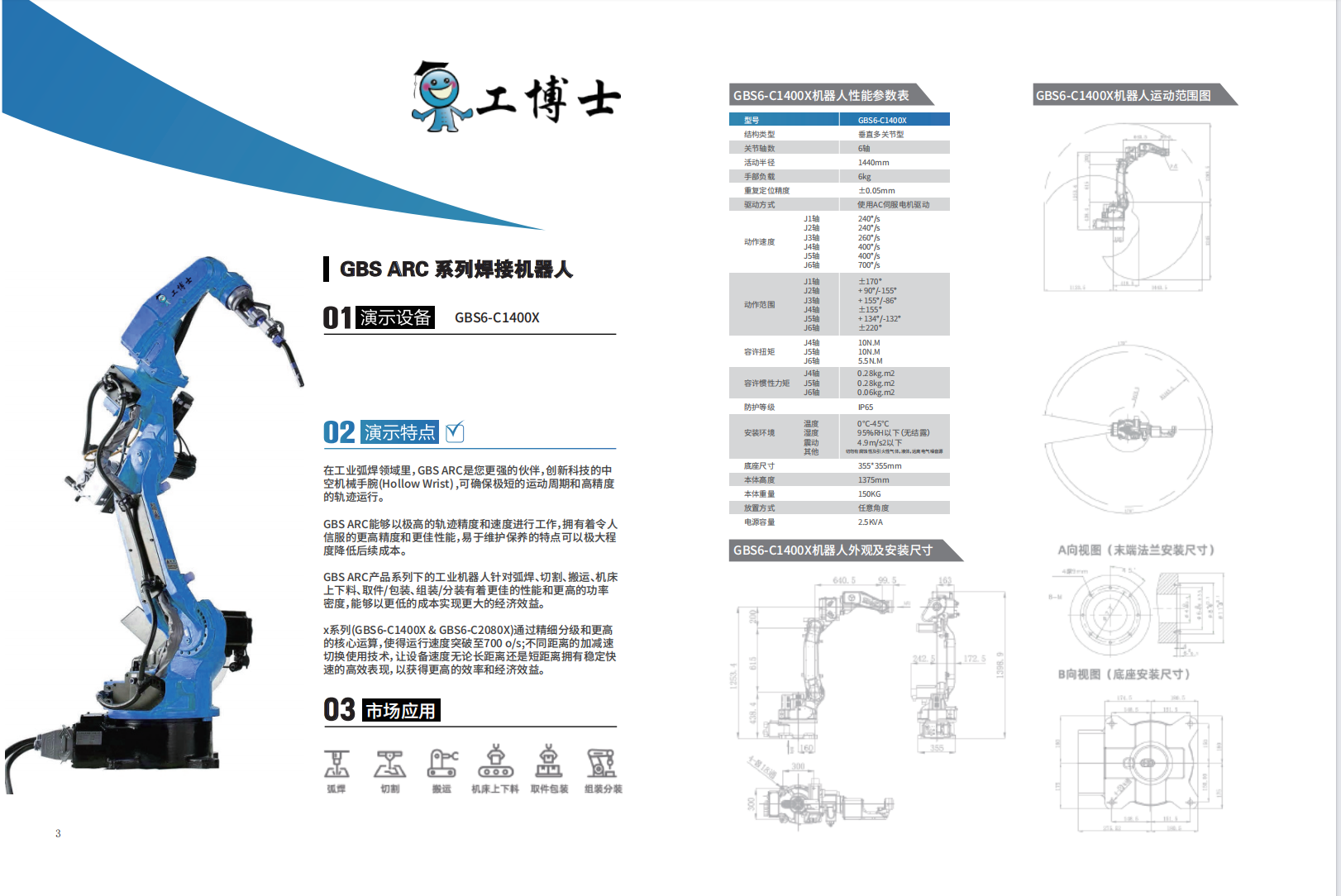 GBS ARC產品系列下的工業機器人針對弧焊、切割、搬運、機床上下料、取件/包裝、組裝/分裝有著更佳的性能和更高功率密度,能夠以更低的成本實現更大的經濟效益。