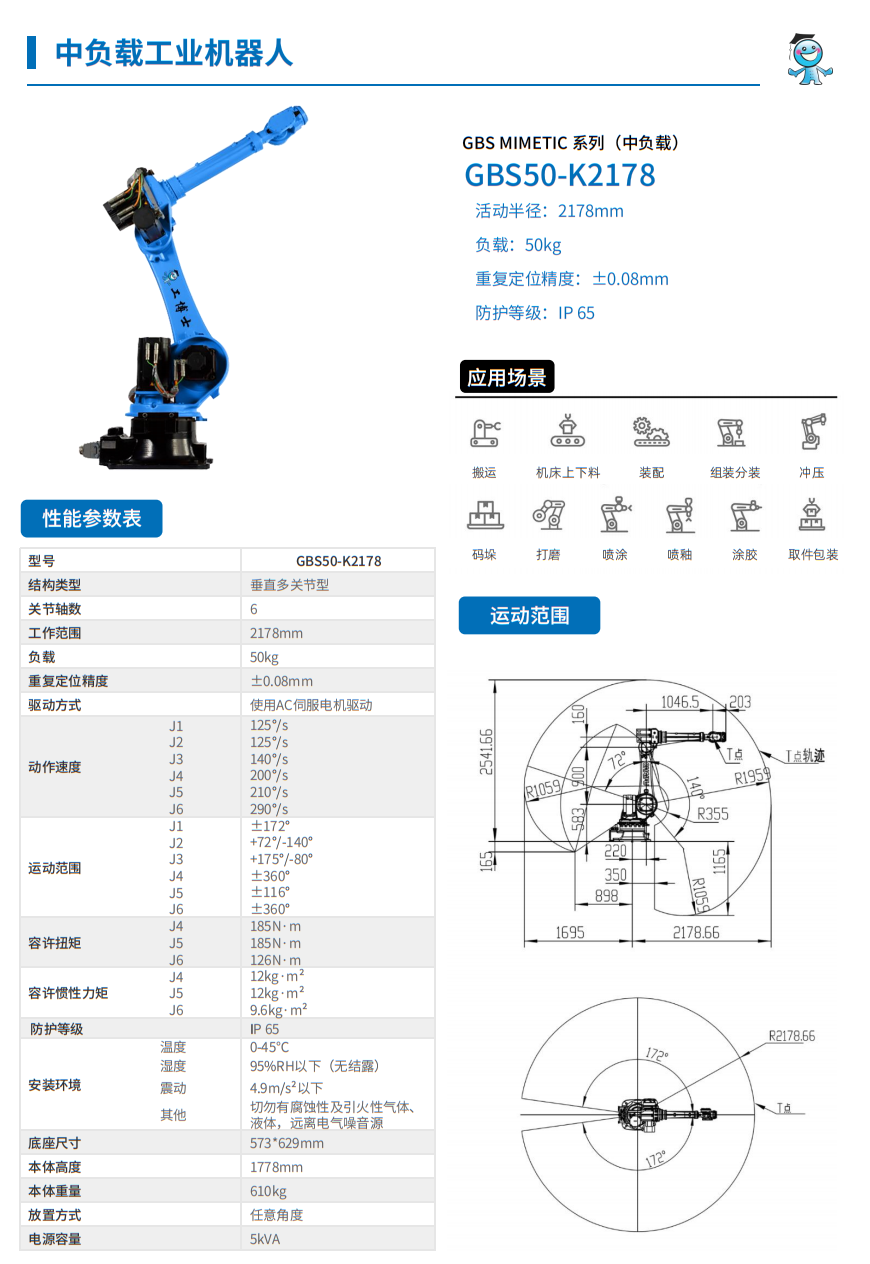 工博士機器人 MIMETIC系列(中負載)GBS50-K2178 負載50kg 臂展2178mm |