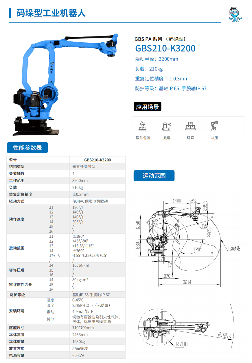 工博士機器人 GBS PA系列(碼垛型)GBS210-K3200 負(fù)載210kg 臂展3200mm |