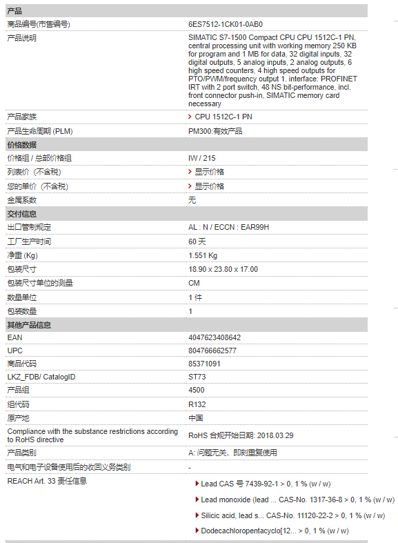 西門子PLC 6ES7 512-1CK01-0AB0 CPU 1512C-1 PN S7-1500