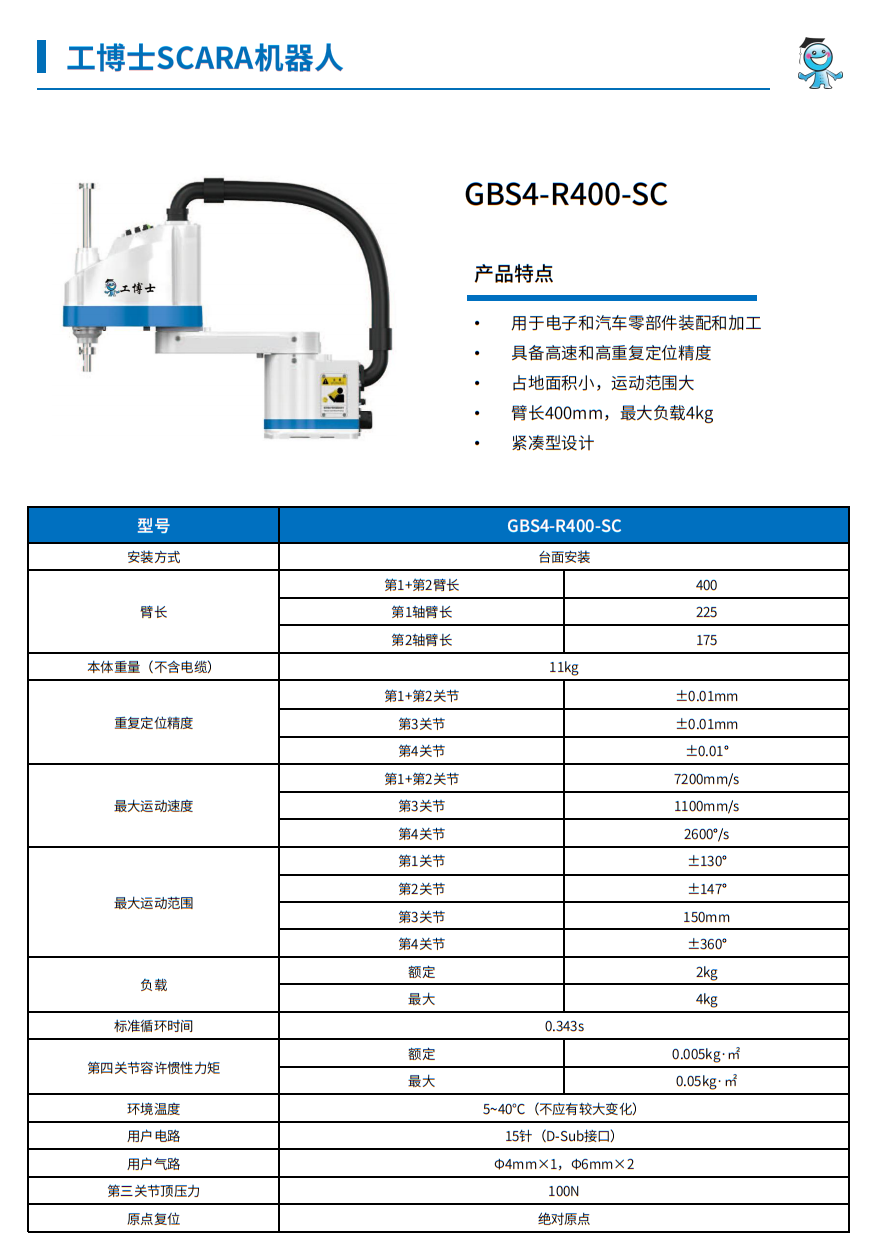 工博士SCARA機(jī)器人 GBS4-R400-SC 負(fù)載4kg 臂長(zhǎng)400mm