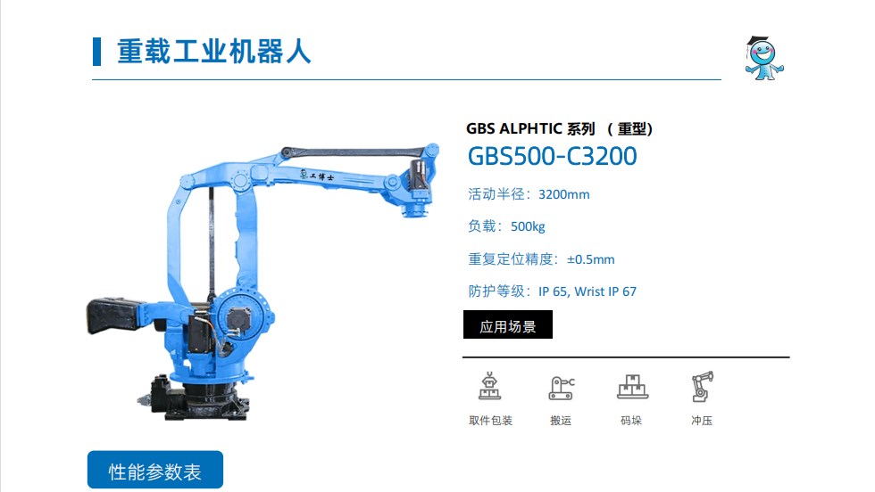 工博士擁有全系列工業機器人,產品線覆蓋6~500kg大、中、小負載機器人,根據類型可分為通用型、桌面型、焊接型、沖壓型、碼垛型和重型機器人。