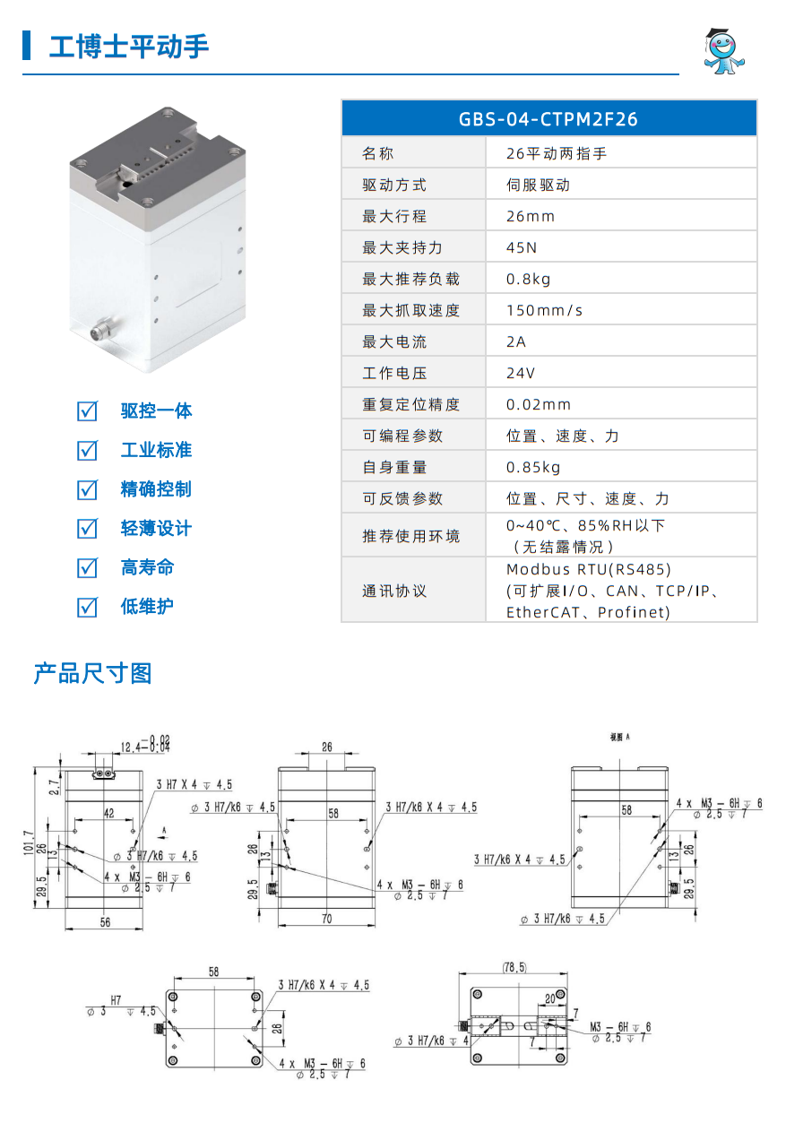 工博士自適應智能協作手GBS-04-CTPM2F26 平動兩指手 負載0.8KG 夾持力45N |