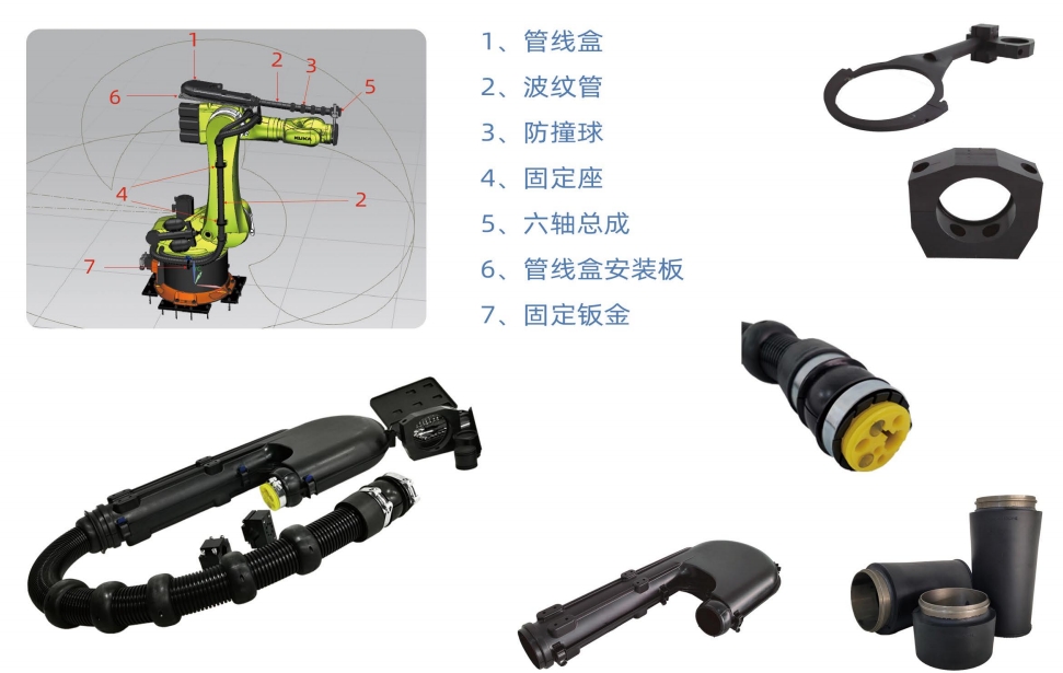 電線束受到外部擠壓、沖擊,就會引起電線束內電線絕緣層損壞,導致電線之間的短路,使得某些電氣設備出現失控、熔斷等問題。生產線上的工業機器人可以裝配管線包,有個這個線管包后不僅運行會更加順暢,基本上沒有出現故障,即使出現了故障,更換起來也會非常方便,大大節省了裝配和維護時間。
