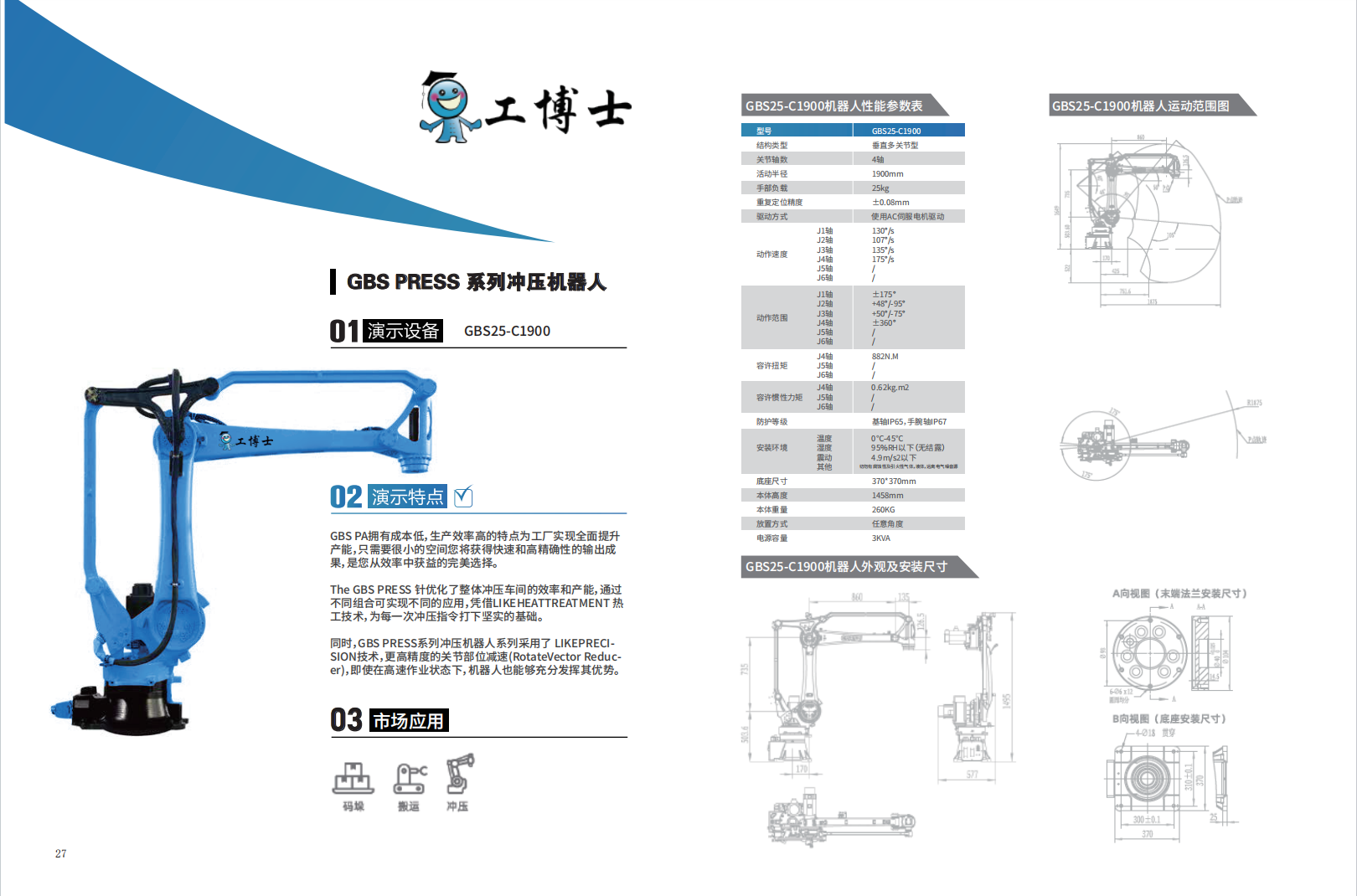GBS PA擁有成本低,生產(chǎn)效率高的特點為工廠實現(xiàn)全面提升 產(chǎn)能,只需要很小的空間您將獲得快速和高***性的輸出成 果,是您從效率中獲益的***選擇。 The GBS PRESS 針優(yōu)化了整體沖壓車間的效率和產(chǎn)能,通過 不同組合可實現(xiàn)不同的應用,憑借LIKEHEATTREATMENT 熱 工技術,為每一次沖壓指令打下堅實的基礎。 同時,GBS PRESS系列沖壓機器人系列采用了 LIKEPRECI