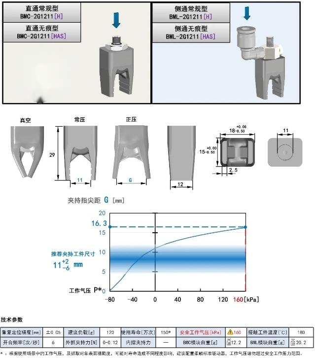 正壓狀態指尖打開,真空狀態夾緊,建議配合柔觸空氣驅動器使用,夾持指尖距G可使用工作氣壓調節柔爪材質分為常規型[H]和無痕型[HAS],當工件重量輕,或十分柔軟,落料時易粘連吸附于柔爪上時,應優選無痕型材質[HAS]。