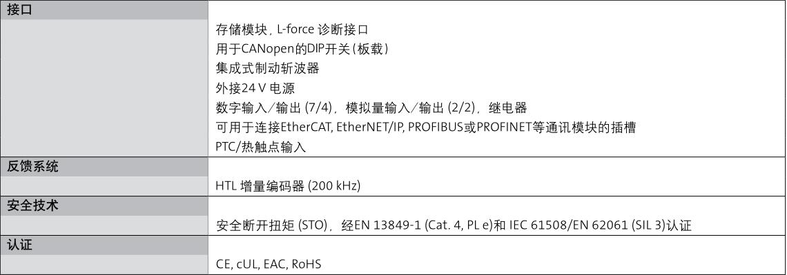 · 可選配符合SIL 3(EN IEC 62061/EN IEC 61508)和性能等級e(EN ISO 13849-1)的“安全斷開轉矩(STO)”功能