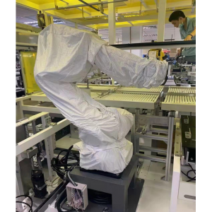 機器人抗靜電防護服主要用于汽車制造、電子加工、3C行業、拋光打磨和上下料等行業, 它主要起到防止涂料沾染機器人,防塵防靜電效果,防止灰塵進入機器人本體對機器人內部線路造成老化形成短路,同時也有效傳到化解生產車間中涂料分子碰撞 所產生的靜電,避免火災、爆燃等安全隱患。