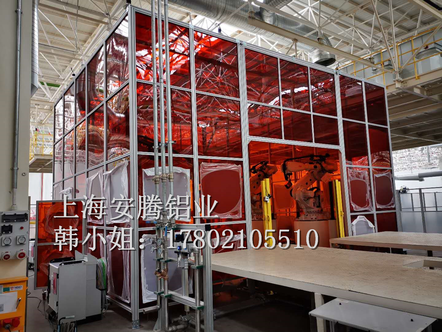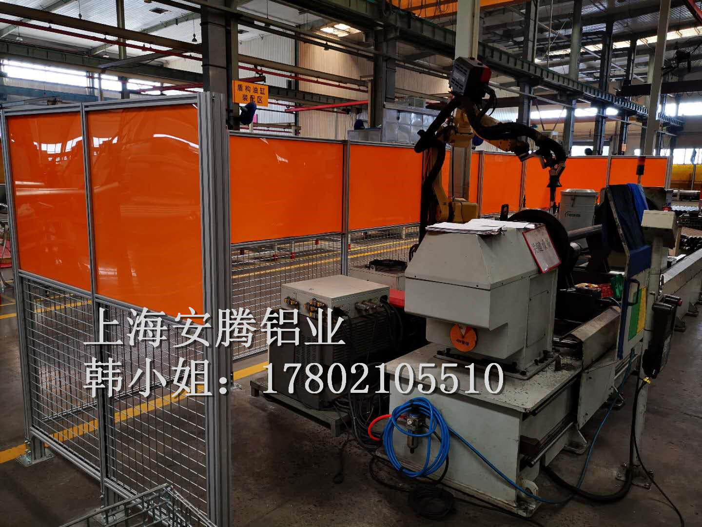 上海安騰鋁業韓小姐 專業承接大型機床,機械,智能裝備,汽車生產流水線機器人安全防護圍欄,機器人弧焊房,機器人除塵房;打磨房等大型工業機械設備防護項目: