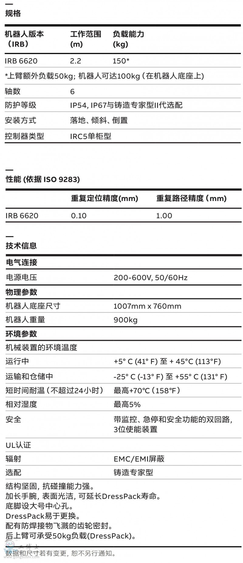 IRB 6620負載150KG,臂展2200mm,ABB大型機器人 鑄造版 高精度 |