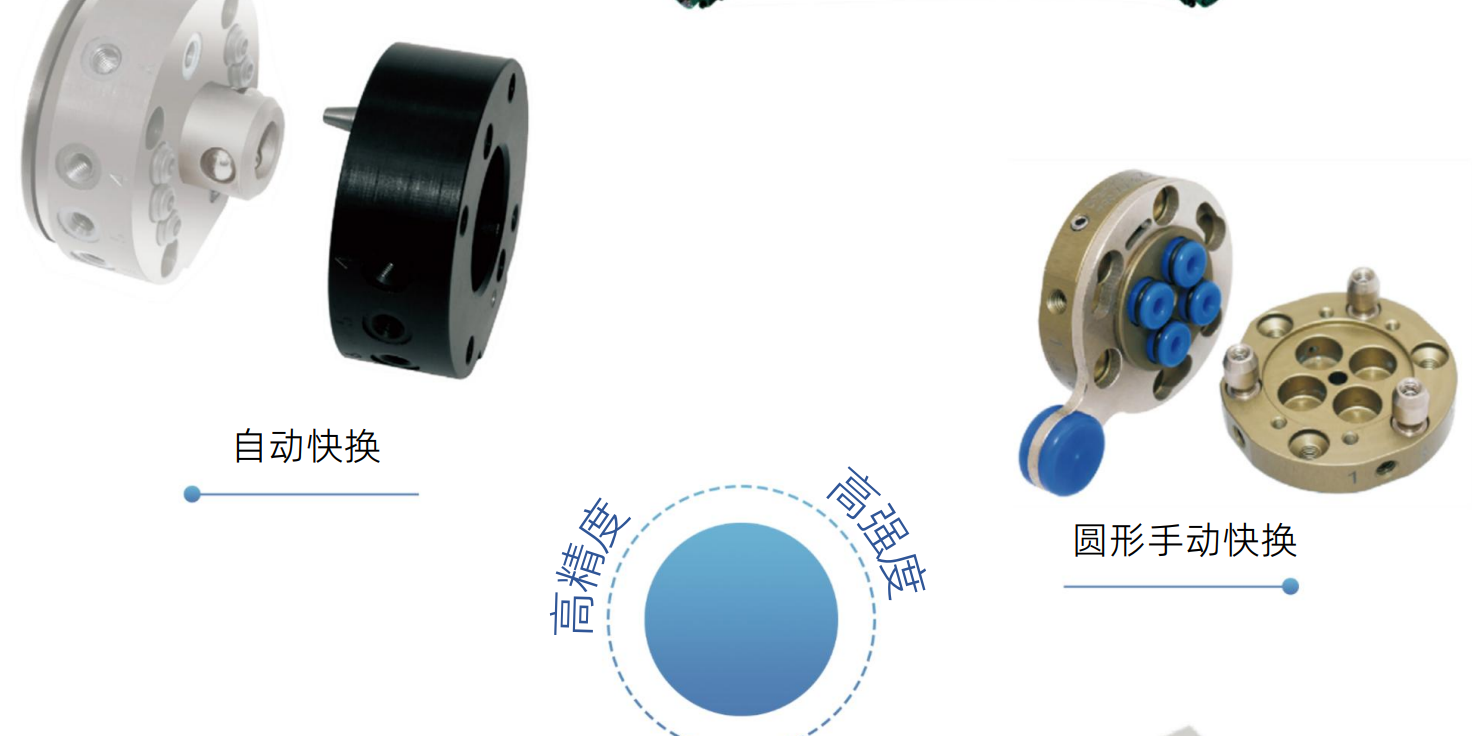 機器人末端快換裝置以高精度、高強度、高性能的產品優勢使單臺機器人能夠在制造和裝 配過程中更換不同的末端執行器以增加柔性