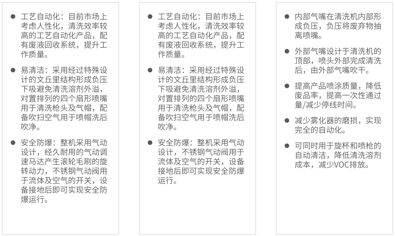 易清潔:采用經過特殊設計的文丘里結構形成負壓下吸避免清洗溶劑外溢,對置排列的四個扇形噴嘴用于清洗槍頭及氣帽,配
