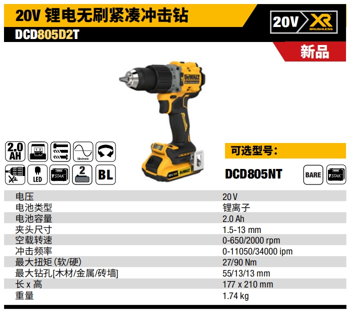 得偉20V鋰電無(wú)刷緊湊沖擊鉆DCD805D2T |