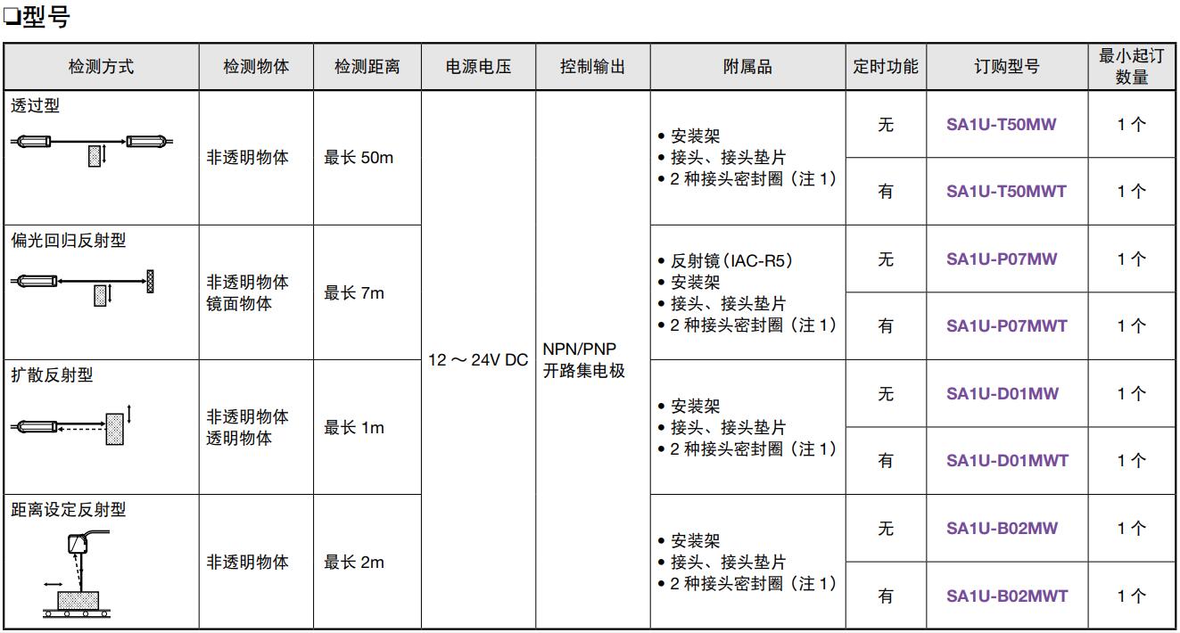可根據用途選擇檢測方式:距離設定反射型(BGS 型)、擴散反射型、透過型以及偏光回歸反射型。