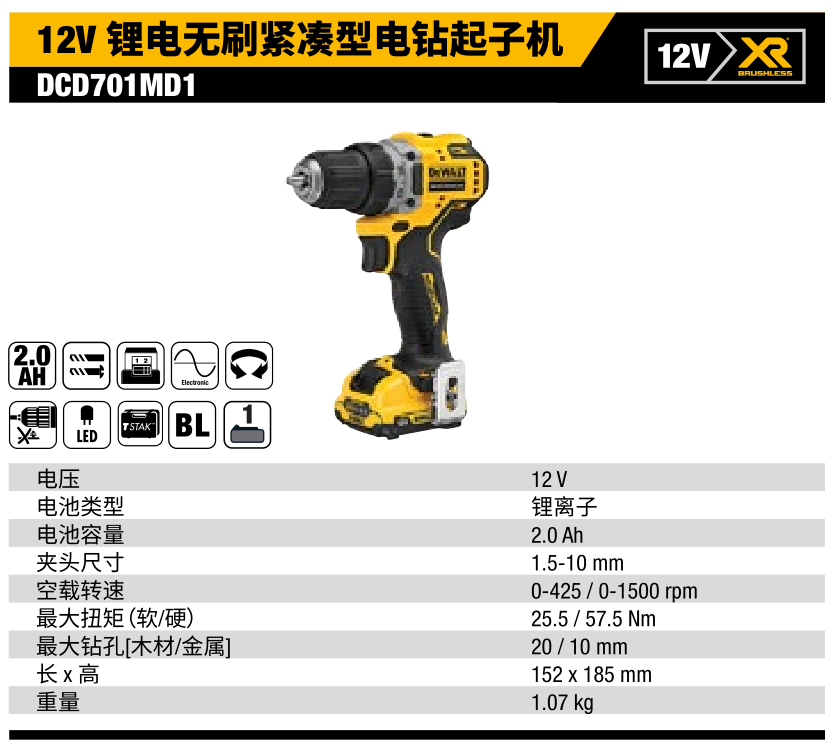 得偉(Dewalt)12V 鋰電無刷緊湊型電鉆起子機DCD701MD1