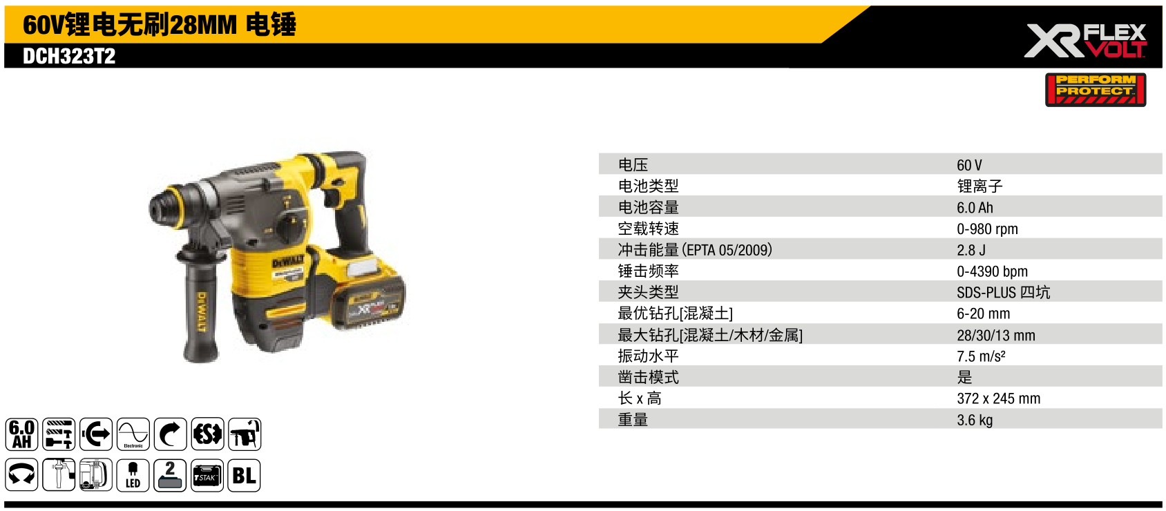 得偉(Dewalt)60V鋰電無刷28MM 電錘DCH323T2