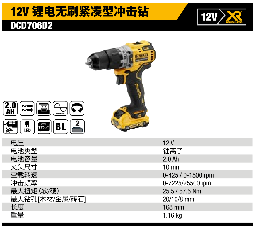 得偉(Dewalt)12V 鋰電無刷緊湊型沖擊鉆DCD706D2