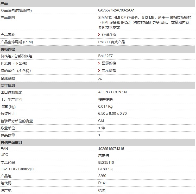 西門子 6AV6574-2AC00-2AA1 存儲卡 512 MB
