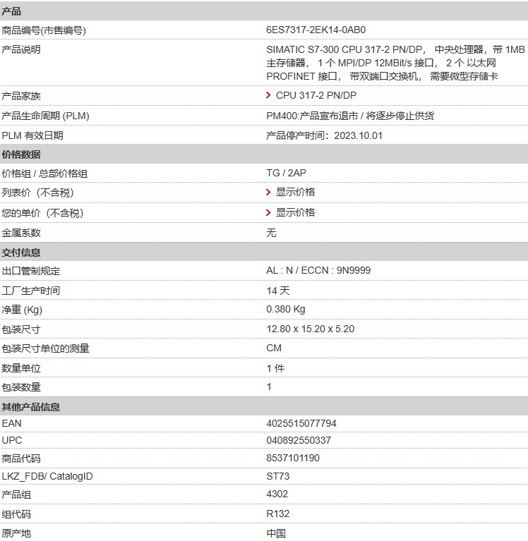 西門子S7-300 CPU 6ES7317-2EK14-0AB0 317-2 PN/DP