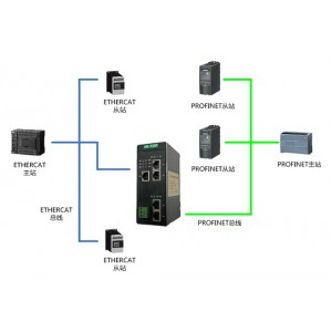 本網(wǎng)關(guān)實(shí)現(xiàn)Profinet轉(zhuǎn)EtherCAT功能,能夠?qū)崿F(xiàn)連接EtherCAT主站PLC的設(shè)備如儀表、變頻器、伺服等接入到S7-1200、S7-1500、CPU315-2PN/DP、S7-400等PROFINET網(wǎng)絡(luò)系統(tǒng),實(shí)現(xiàn)PROFINET網(wǎng)絡(luò)與EtherCAT網(wǎng)絡(luò)的數(shù)據(jù)交互。