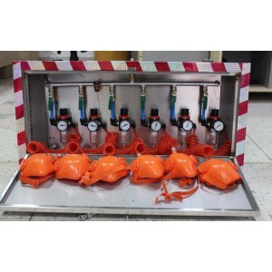 AYH-1A壓風自救器一般形成系統后使用,即由若干組壓風自救裝置安裝在同一個地點形成壓風自救站,每組一般由3~5個頭組成,每個地點裝多少個頭,應視該工作場所的工作人數而定,其安裝頭數應大于在該場所工作的人數。該裝置系統結構簡單,價格便宜,是一種經濟型性自救裝置系統。 作原理:裝置由管道、開閉閥、連接管、減壓組及防護套等5部分組成。當煤礦井下發生瓦斯濃度超標或超標征兆時,扳動開閉閥體的手把氣路通暢,功能裝置迅速完成泄水、過濾、減壓和消音等動作后,此時防護套內充滿新鮮空氣供避災人員救生呼吸。防護套內的空氣壓力為(0.05~0.1)Mpa,防護套外有毒氣體的壓力低于套內壓力,因此外部有害氣體不會進入防護套內對避災人員造成危害。