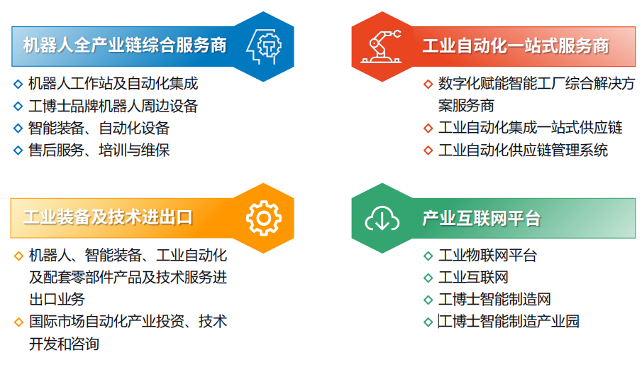公司業務覆蓋智能裝備、產業互聯網、工業自動化、工業裝備出口四大核心領域。致力于打造行業機器人、